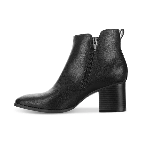 - Almond-toe pull-on booties with inner ankle zipper closure