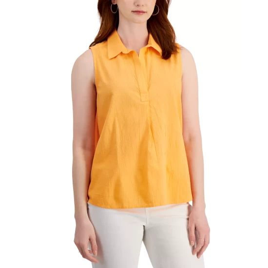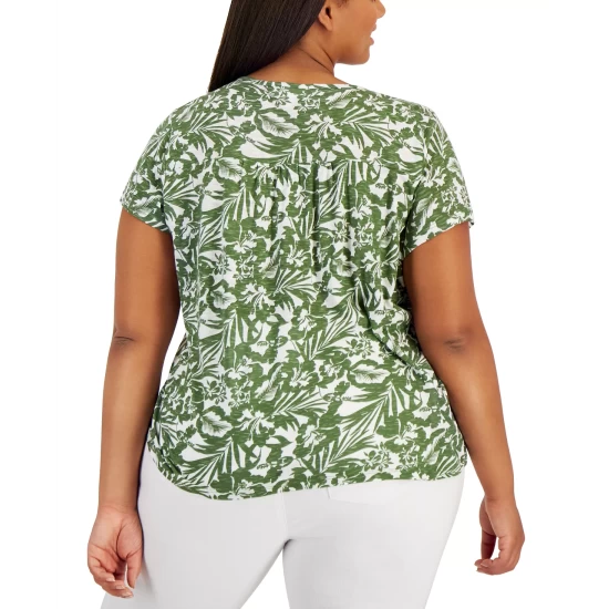 Style & Co’s plus size top combines embroidered details and tassel ties with a comfortable jersey knit for a hybrid T-shirt-meets-peasant top.