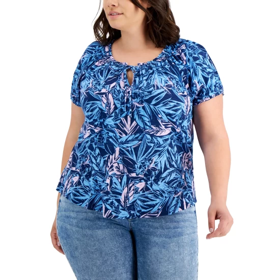 A tropical-inspired print covers every inch of this plus size top from Style & Co, complete with short puff sleeves and a tie at the neckline.