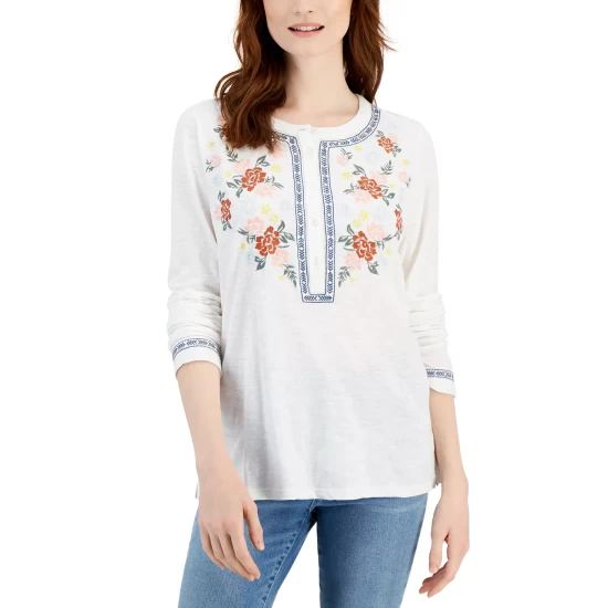 Vintage-inspired embroidery highlights textured fabric, bringing an updated look in timeless charm to this knit top from Style & Co.