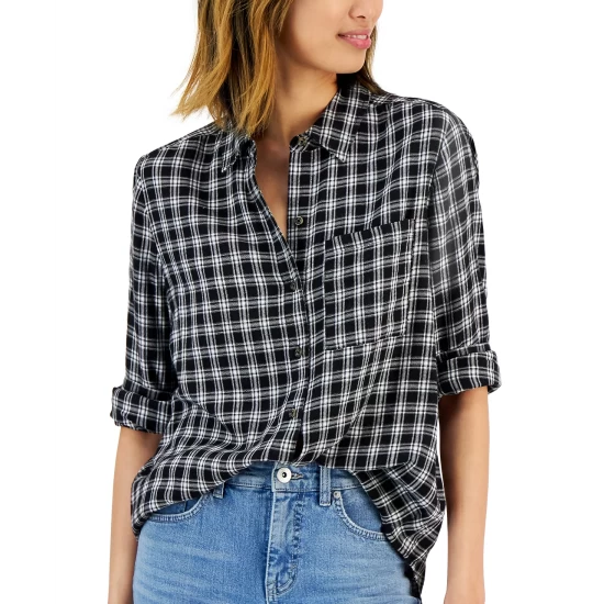 For a classic look with the comfort of cotton, Style & Co finishes this button-front shirt with a sleek plaid print, creating a stylish go-to.
