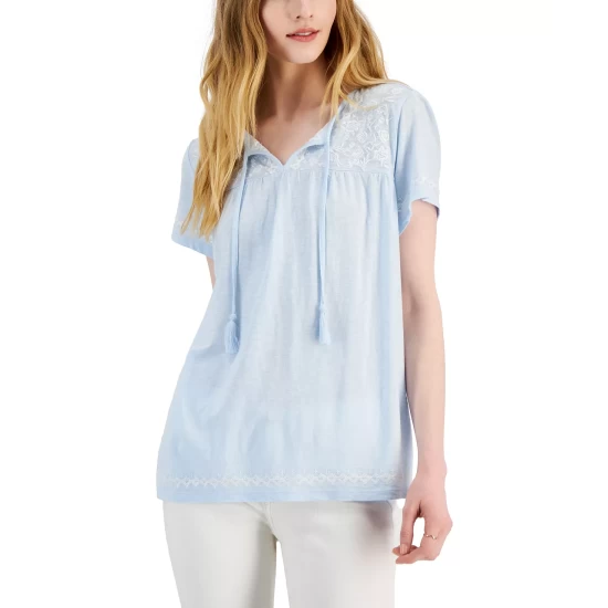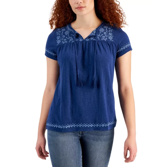 This casualwear top by Style & Co is charmingly finished with a sweet, embroidered detail, lending a chic finish to this everyday look.