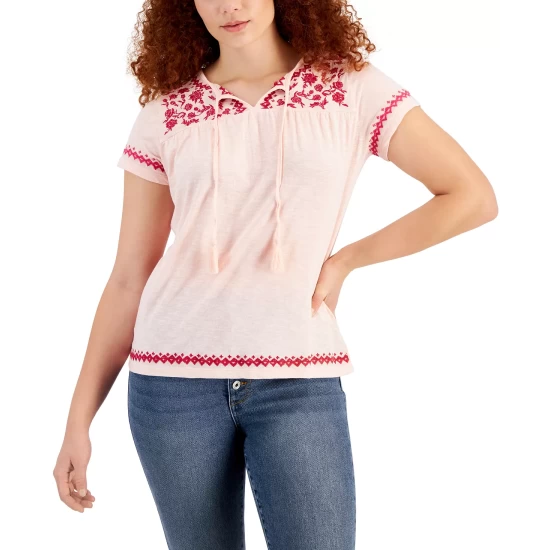 This casualwear top by Style & Co is charmingly finished with a sweet, embroidered detail, lending a chic finish to this everyday look.