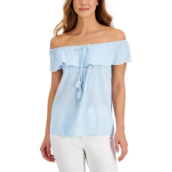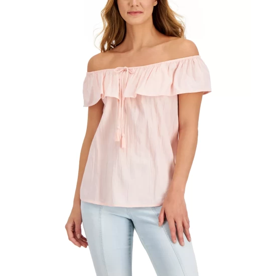 - On-off shoulder neckline with ruffle and tie detail