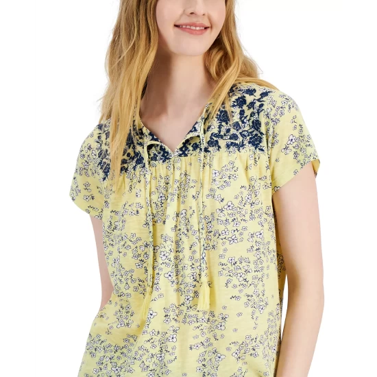 Energize your off-duty collection with this split-neck top from Style & Co, featuring fun florals, tassel detail and a chic, embroidered finish.