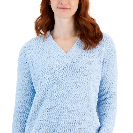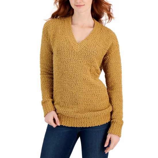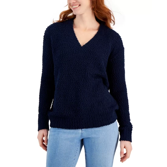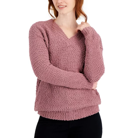 Style & Co’s cozy bouclé sweater is a classic V-neck pick designed with long sleeves and a comfortable fit.